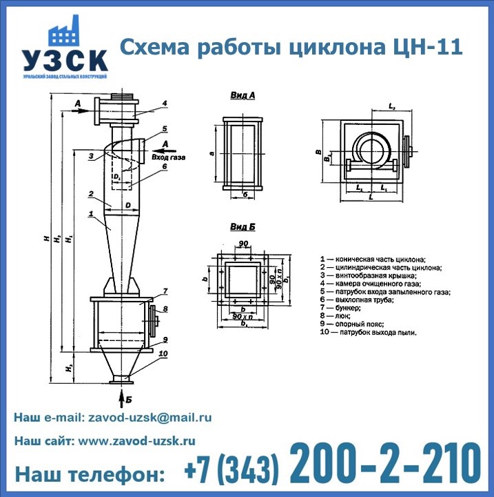 При этом ощутимой разницы в цене между универсальным и узконаправленным, подобранным в соответствии с конкретными техническими требованиями циклоном, нет. Стоимость воздухоочистительного оборудования типа циклон обусловлена маркой и толщиной стали, из которого он изготовлен, сложностью и специфичностью конструкции, наличием дополнительного оснащения (бункер, улитка и другие). При необходимости, на заводе УЗСК в Таганроге будет изготовлен циклон по индивидуальным техническим чертежам заказчика.
